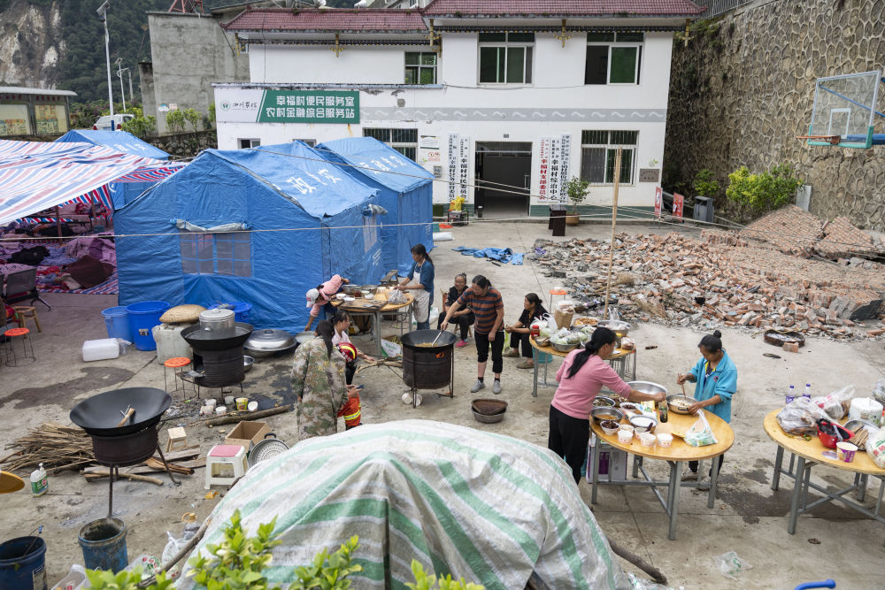 9月7日,在草科鄉(xiāng)政府安置點內(nèi),當?shù)厝罕姙樵趫鼍仍藛T準備飯菜。