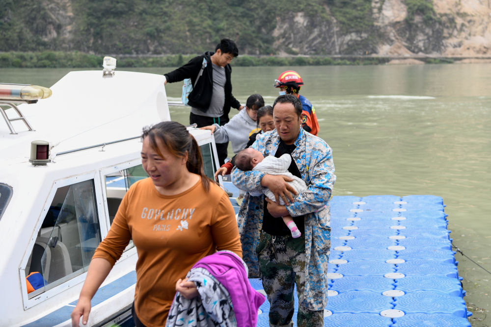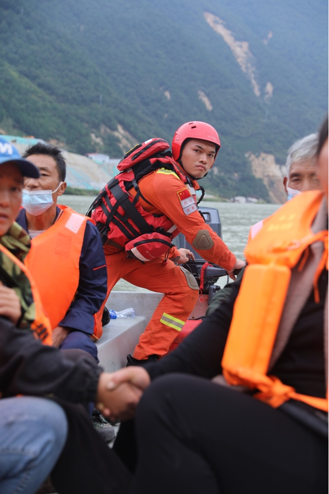 ↑9月8日,在四川石棉縣新民鄉(xiāng)臨時碼頭,救援人員駕駛沖鋒舟護送受災(zāi)群眾回家。