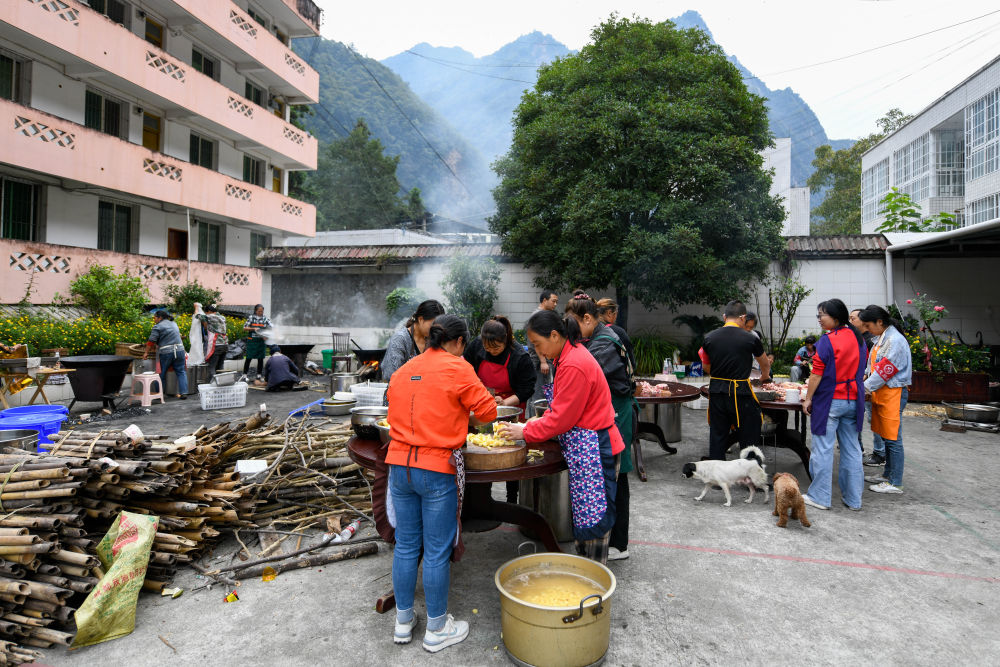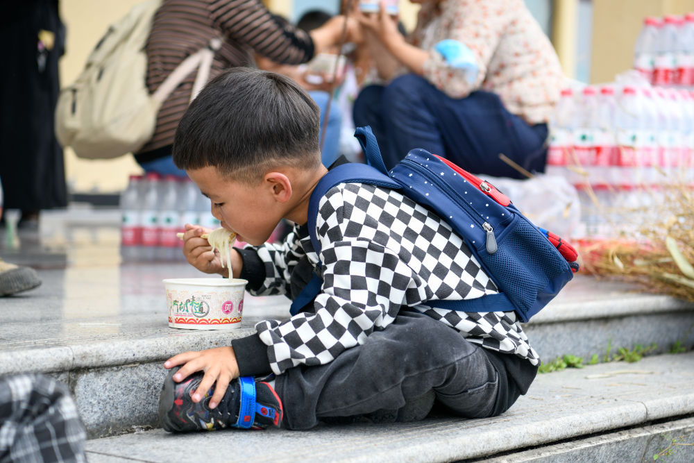 采訪當天,這個安置點里的伙食團依舊承包了在場所有村民、救援人員以及采訪隊伍的午飯,大家依次排隊領(lǐng)取,補充體力。一旁的草科鄉(xiāng)中心小學(xué)內(nèi),118名孩子也享用著熱氣騰騰的午飯。