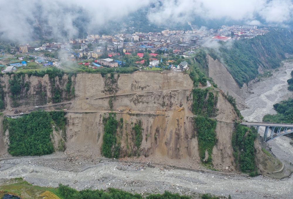 9月9日,搶險人員在搶通磨西鎮(zhèn)附近道路(無人機照片)。