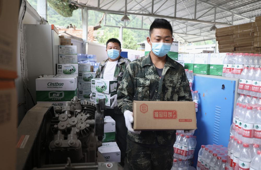 9月7日,在幸福村二組,村民與消防救援隊員搬運直升機送來的水和食物。