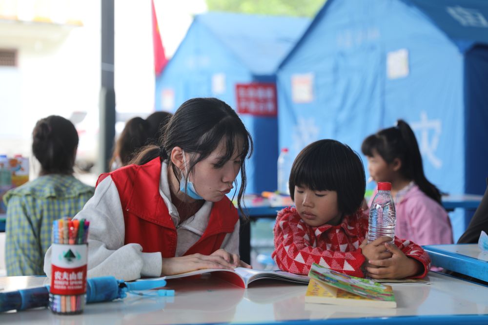9月9日,在王崗坪鄉(xiāng)安置點內(nèi),志愿者在給小朋友講故事。