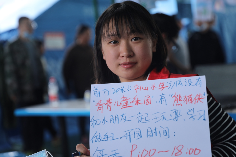 看到我手里的照相機,他們十分好奇。一位叫駱雅萱的小朋友拉了拉我的衣角說:“姐姐,我想用你的相機給‘熊貓俠’拍一張照片好嗎?”“熊貓俠”是這里的一名志愿者,地震發(fā)生以來一直在安置點陪伴著小朋友們,大家都很喜歡她。我答應(yīng)了小朋友的請求,教她按下快門,看到自己拍的照片,她開心地給“熊貓俠”展示。