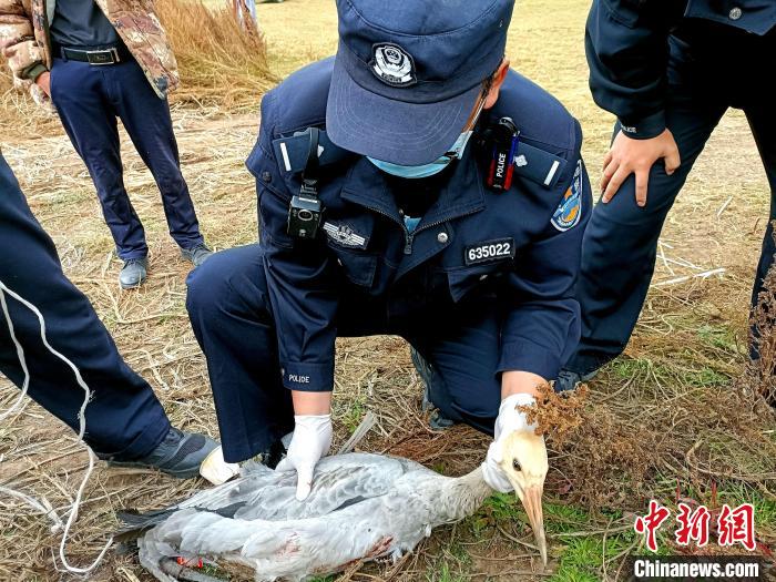 圖為公安民警救助黑頸鶴幼鳥。陳文年 攝