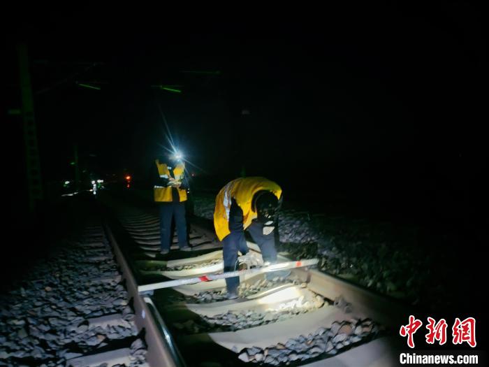 圖為西寧工務段職工用道尺對線路幾何尺寸進行檢查、記錄。 魏強 攝