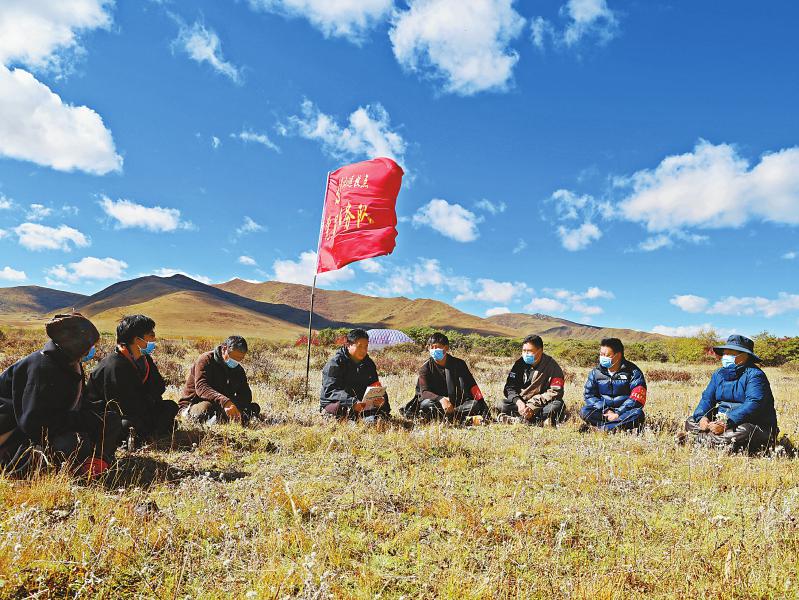 10月20日,阿壩縣賈洛鎮(zhèn)勒坤瑪村一處遠(yuǎn)牧點(diǎn)上,干部和牧民一道學(xué)習(xí)黨的二十大精神。尕讓澤登 攝