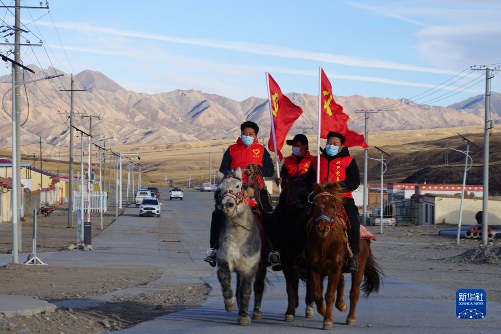冬日,地處祁連山腳下的達玉村陽光遍灑。雖然天氣晴好,但寒風(fēng)的凜冽絲毫不減。才讓扎西一手握著黨旗,一手拽緊韁繩,熟練地蹬上馬鐙、躍身上馬。