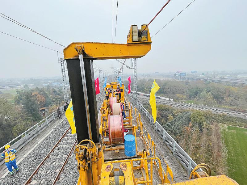 1月8日,成蘭鐵路成川段首條接觸線(xiàn)成功架設(shè)。
