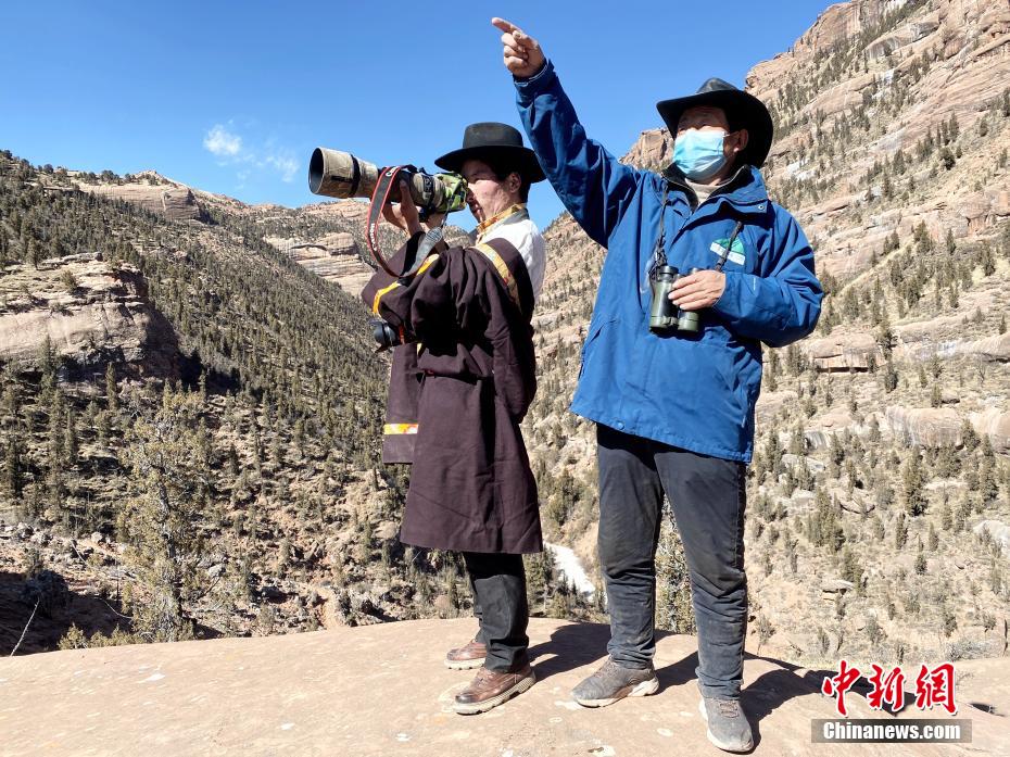 圖為達(dá)杰朋措(左)和生態(tài)管護(hù)員在瀾滄江源園區(qū)拍攝野生動(dòng)物。仁青達(dá)杰 攝