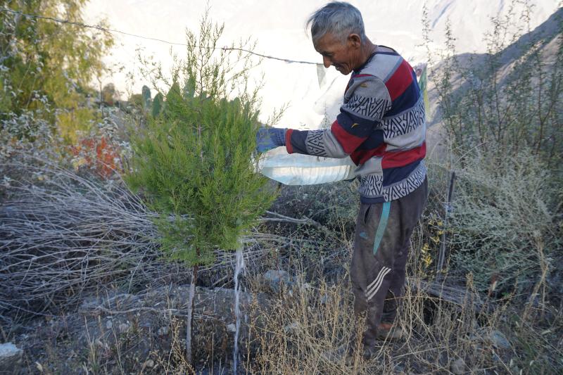 1950年出生在茂頂村木達(dá)水村民小組的丁爭(zhēng),小時(shí)候多次看到雨季村里洪水成災(zāi),泥石流橫行,山體滑坡的場(chǎng)景。那時(shí)經(jīng)濟(jì)落后,村民日子過(guò)得苦。丁爭(zhēng)隨母親去頭人家放牛,由于天氣炎熱,饑渴難耐,母親就摘一個(gè)頭人家蘋果充饑,被頭人關(guān)了3天3夜。1957年,迪慶發(fā)展迎來(lái)新曙光,丁爭(zhēng)家分到了田、牲畜、果樹,當(dāng)家做主人,從此過(guò)上了新生活。2007年,丁爭(zhēng)兒孫滿堂,家務(wù)事不用操心,他就想植樹造林、保護(hù)生態(tài),防止山洪暴發(fā)和水土流失,造福子孫后代。于是,他拿著家里的鎬、盆,踏上植樹造林的漫漫長(zhǎng)路。 在植樹造林的初期,丁爭(zhēng)老人靠自家的舊桶舊盆給樹苗澆水。隨著旭龍電站、忠態(tài)水庫(kù)等項(xiàng)目進(jìn)場(chǎng)施工,丁爭(zhēng)老人就撿拾一些舊水管、舊鐵絲,把水引到離幼苗最近的地方,以便澆水。用廢棄的鐵絲把樹苗固定好,以免風(fēng)吹雨打樹苗飄搖致根系斷裂,影響生長(zhǎng)。起初由于管理經(jīng)驗(yàn)不足,澆水困難,1年種100棵樹苗,成活僅幾棵,但他沒有退縮,沒有喪失信心,查找成活率不高的原因,采取相應(yīng)的改進(jìn)措施,逐年提高了樹苗成活率。