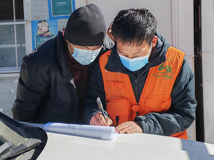 白瑪稱來(右)對(duì)過往駕乘人員進(jìn)行認(rèn)真登記