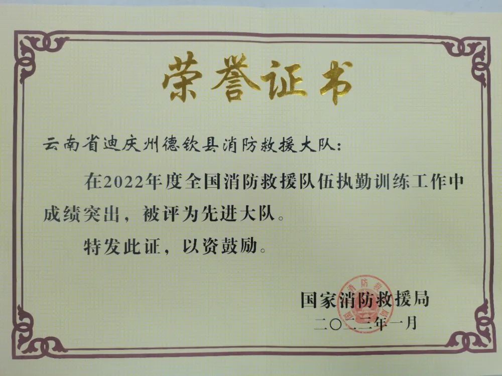日前,國(guó)家消防救援局印發(fā)《關(guān)于表彰2022年度執(zhí)勤訓(xùn)練工作先進(jìn)單位和個(gè)人的通報(bào)》,德欽縣消防救援大隊(duì)被表彰為2022年度全國(guó)消防救援隊(duì)伍執(zhí)勤訓(xùn)練工作先進(jìn)大隊(duì)。