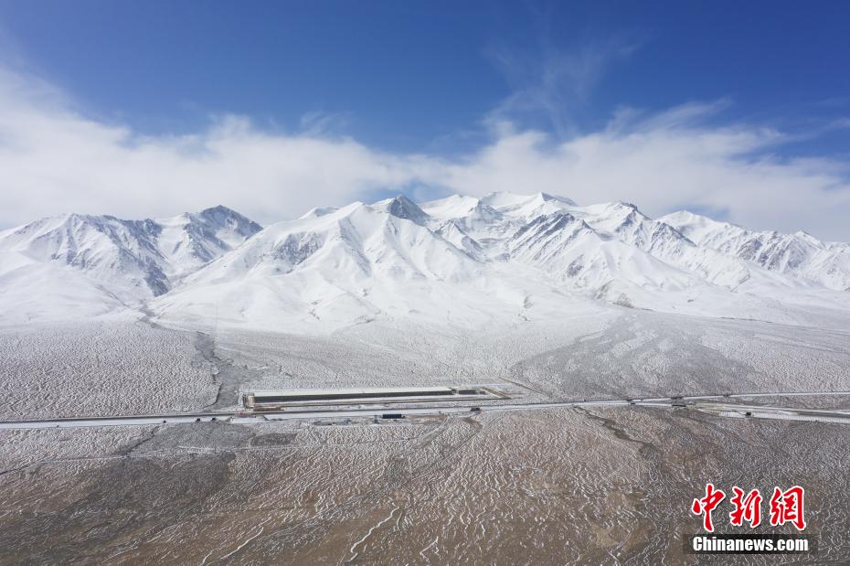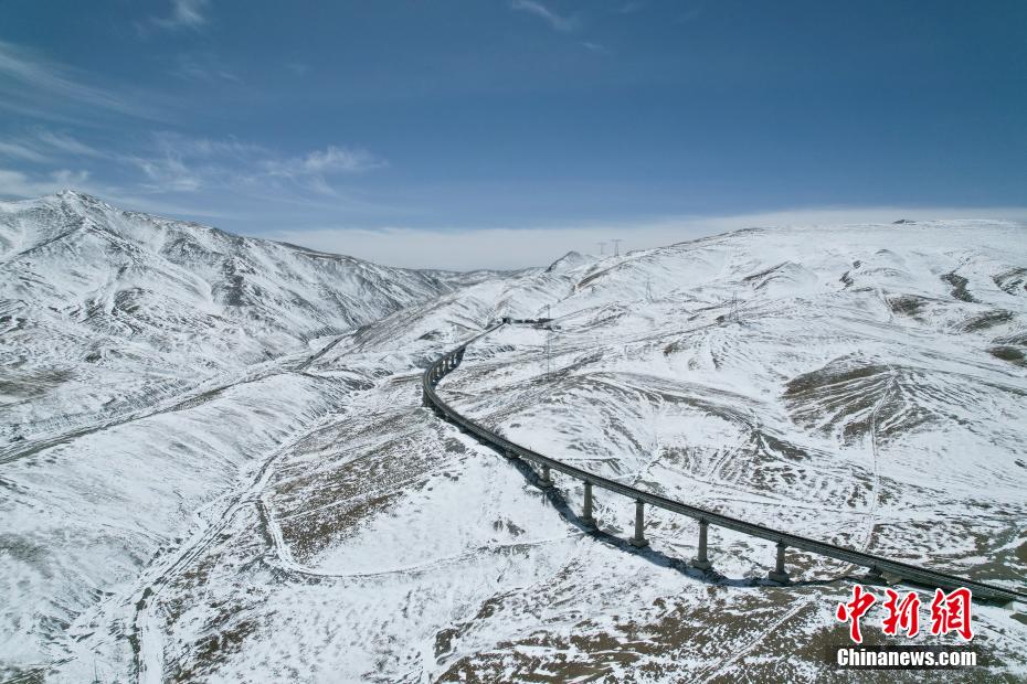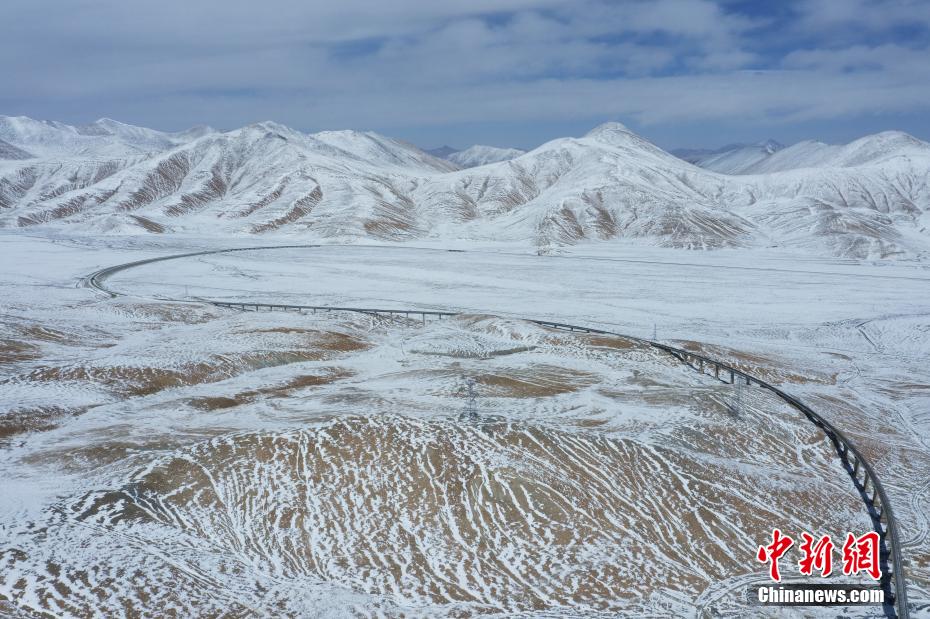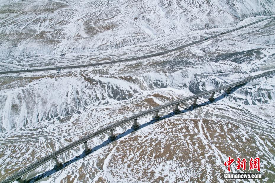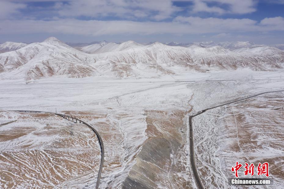 3月25日,航拍位于青海省海西蒙古族藏族自治州境內(nèi)的昆侖山。一場春雪過后,青海省海西州境內(nèi)的昆侖山銀裝素裹,青藏鐵路和青藏公路并行其中,雄偉壯麗。