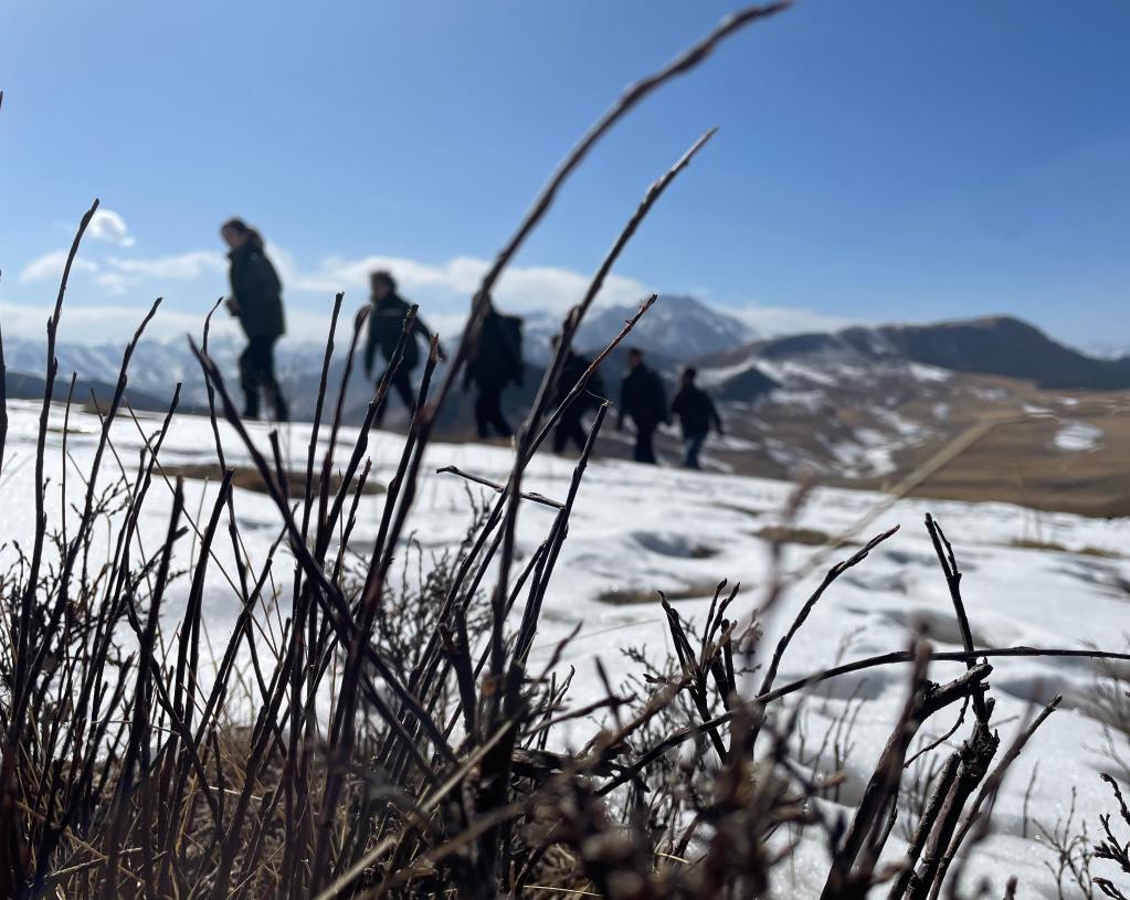 張麗萍(左一)和隊(duì)員們在祁連山國家公園進(jìn)行巡護(hù)(2023年3月7日攝)。新華社記者 李琳海 攝