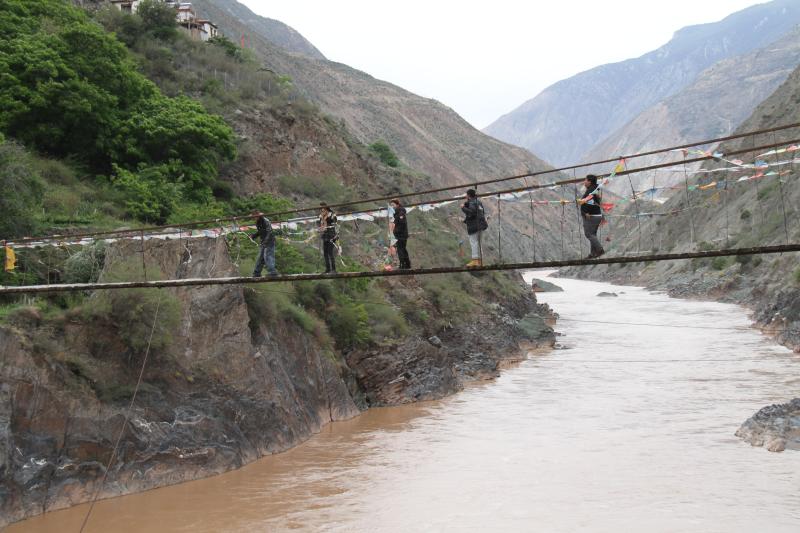 近日,“有一種叫云南的生活”大型調(diào)研采訪活動(dòng)德欽分隊(duì)十多名來(lái)自省內(nèi)外的記者采訪團(tuán)走進(jìn)佛山鄉(xiāng),茶馬古道梅里雪山段瀾滄江上的竹篾溜索、鐵索橋,以及如今還在使用的便橋引起了大家極大興趣。三種渡江方式,代表了三個(gè)時(shí)代的變遷。離此處500米左右下游的鋼筋混凝土大橋則是近幾年建成的,寬約十米的橋面上汽車轟鳴而過(guò)。