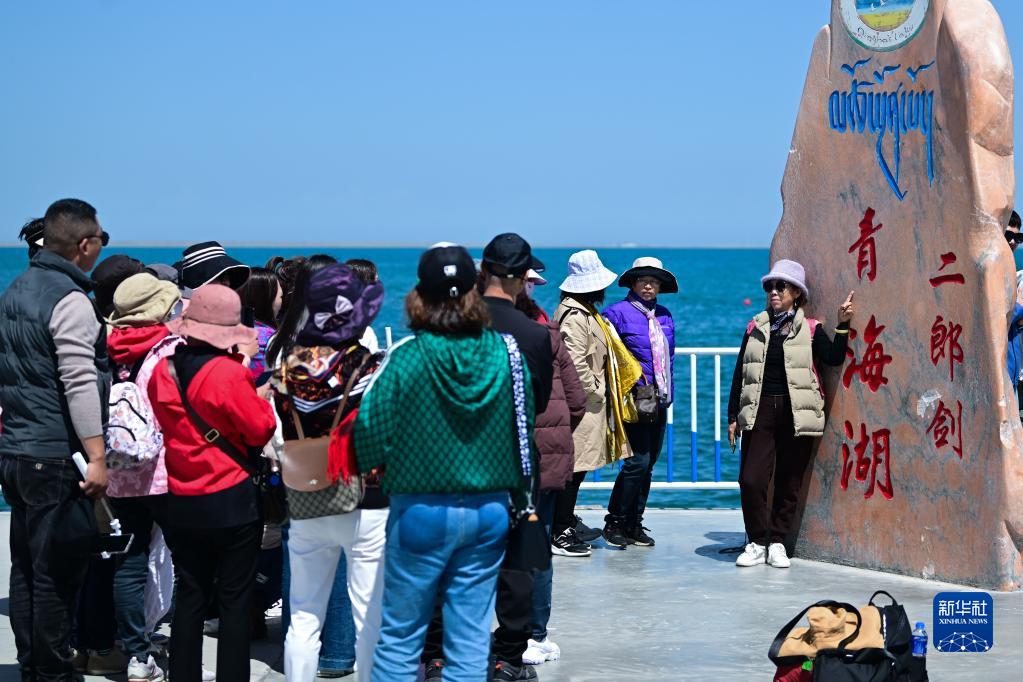 5月18日,在青海湖二郎劍景區(qū),游客在拍照。新華社記者 張龍 攝