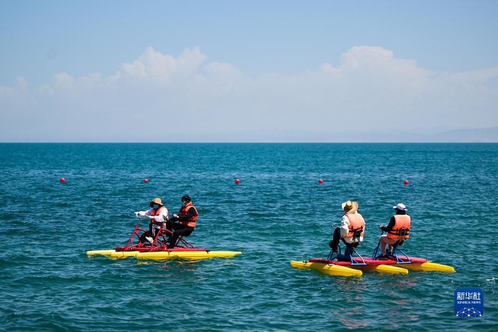 5月18日,在青海湖二郎劍景區(qū),游客在體驗(yàn)水上游樂項(xiàng)目。新華社記者 張龍 攝