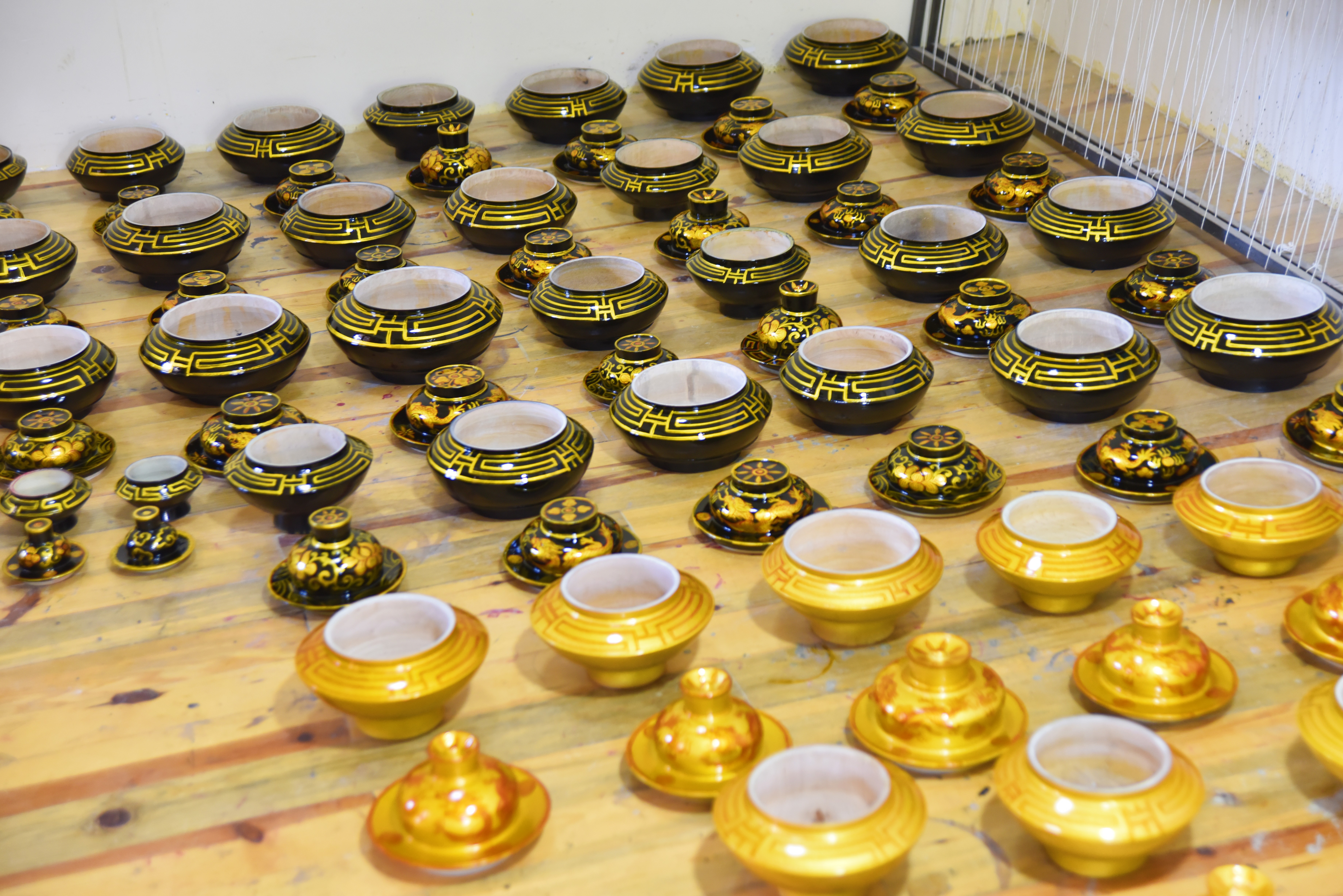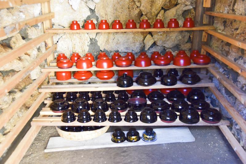 木碗的整個(gè)制作過程需要20多道工序,其中,上漆時(shí)使用的是天然土漆。刷漆后直接放到專門的地窖里陰干。