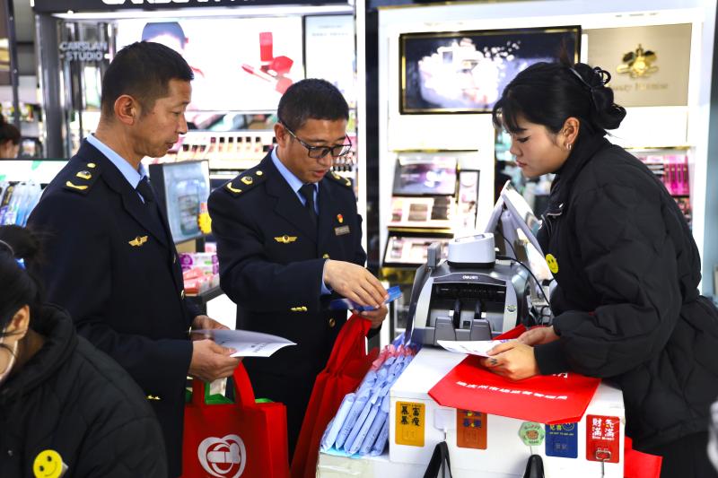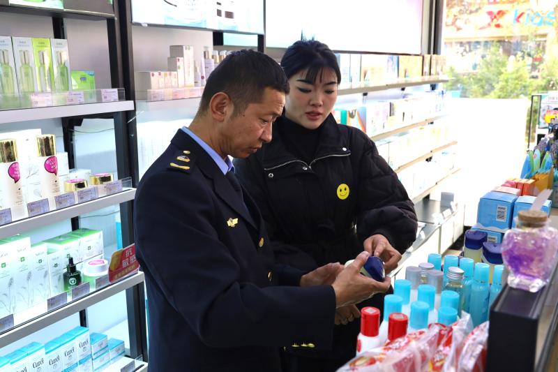 啟動儀式結(jié)束后,市場監(jiān)督管理部門的工作人員為現(xiàn)場群眾發(fā)放并講解宣傳冊,同時為化妝品經(jīng)營商進行上門普法,規(guī)范企業(yè)經(jīng)營行為。