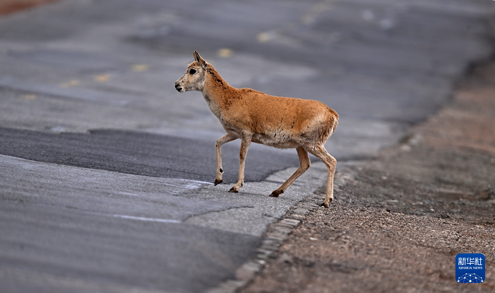 5月28日,在青??煽晌骼?,一只雌性待產藏羚羊通過青藏公路。新華社記者 張宏祥 攝