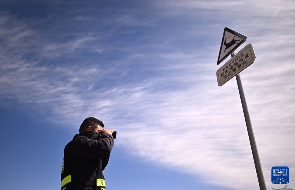??5月29日,可可西里管理處五道梁保護站工作人員江文多杰在青藏公路附近查看藏羚羊活動軌跡。新華社記者 張宏祥 攝