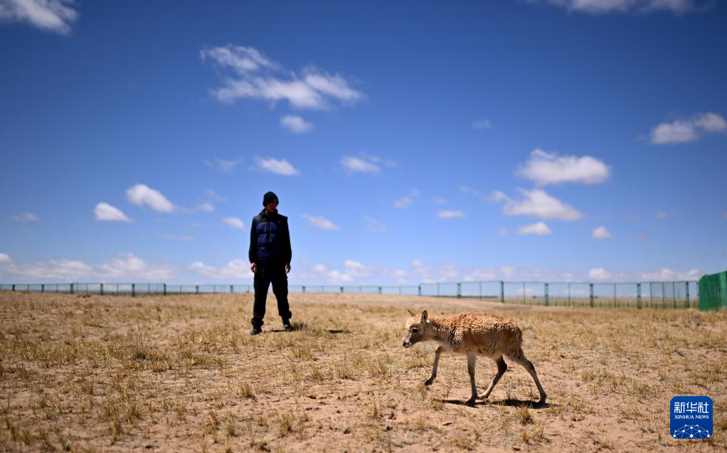 在可可西里國(guó)家級(jí)自然保護(hù)區(qū)索南達(dá)杰保護(hù)站,一只藏羚羊在野生動(dòng)物救助中心活動(dòng)(5月30日攝)?!⌒氯A社記者 薛玉斌 攝