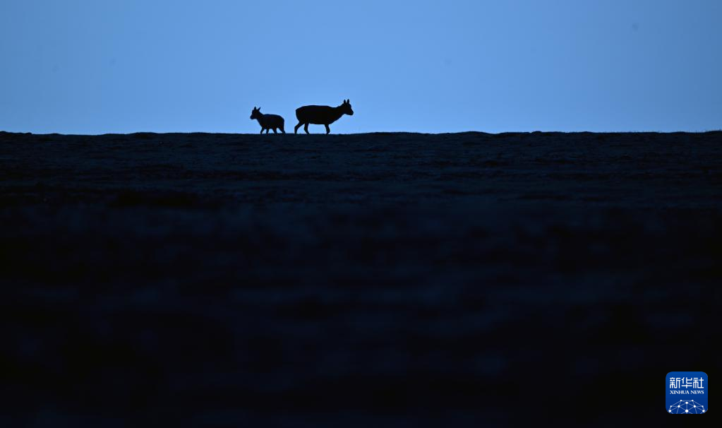 兩只藏羚羊在可可西里卓乃湖區(qū)域活動(dòng)(6月17日攝)。新華社記者 張宏祥 攝