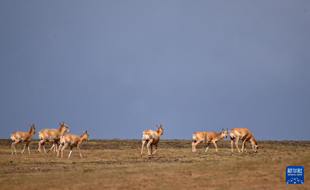 一群藏羚羊在可可西里卓乃湖區(qū)域活動(dòng)(6月18日攝)。新華社記者 張宏祥 攝
