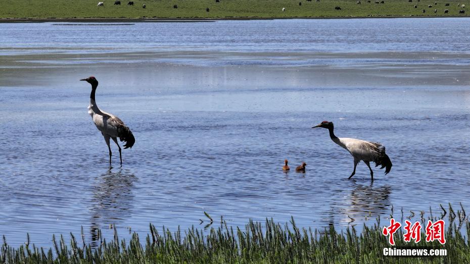圖為門(mén)源縣境內(nèi)黑頸鶴一家水邊散步。海西州融媒體中心供圖