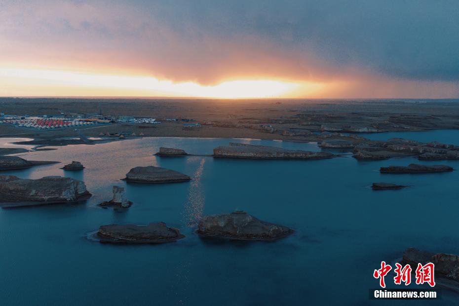 6月24日,清晨的降雨過后,青海省海西蒙古族藏族自治州大柴旦烏素特(水上)雅丹天空澄碧,纖云不染,太陽緩緩上升,給天邊鑲嵌了一條金邊,與烏素特(水上)雅丹遙相輝映,風(fēng)光旖旎。