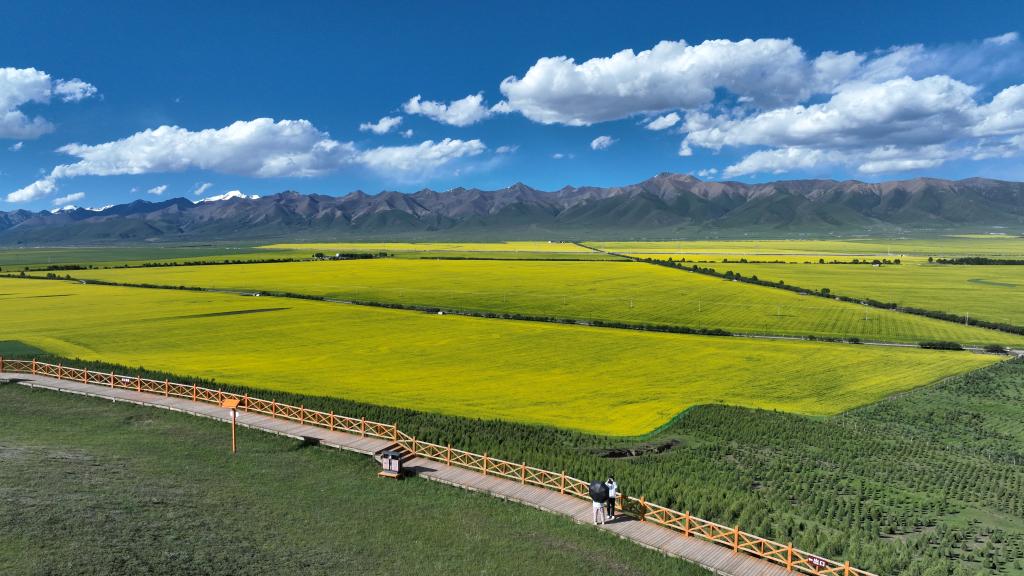 夏日,在位于祁連山腹地的青海省海北藏族自治州門(mén)源回族自治縣境內(nèi),油菜花競(jìng)相綻放,花海、雪山、草原共同組成色彩斑斕的祁連山夏日畫(huà)卷。