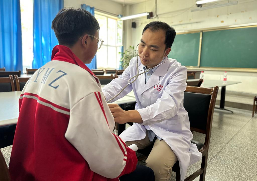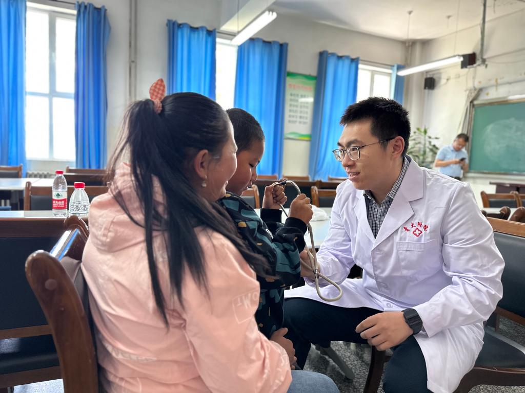 7月7日,在青海省海北藏族自治州海晏縣寄宿制民族中學(xué),北京協(xié)和醫(yī)院醫(yī)生在為學(xué)生做檢查。新華社記者 張子琪 攝