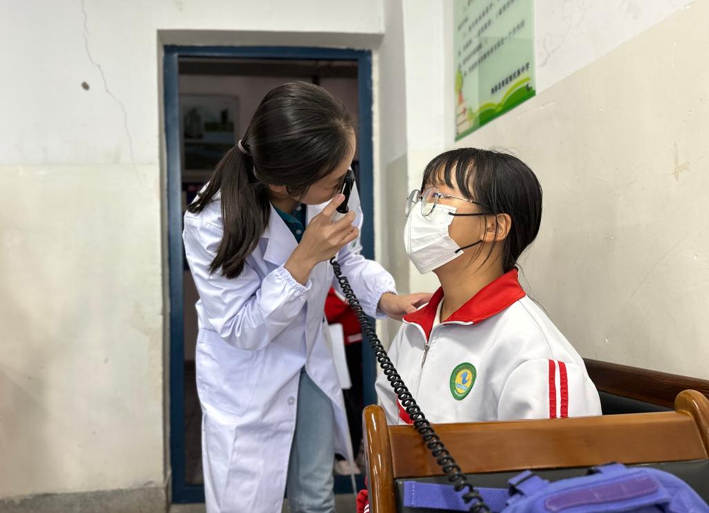 教學(xué)樓里,10名北京協(xié)和醫(yī)院的專家兩人一組,為200名學(xué)生進(jìn)行骨科、眼科、兒科綜合檢查?!翱凑胺?。佩戴眼鏡后一定要按期復(fù)查。課間可以摘下眼鏡按摩一下,避免過度用眼?!北本﹨f(xié)和醫(yī)院眼科專家李冰一邊拿著檢眼鏡細(xì)心檢查,一邊耐心地講解用眼知識。