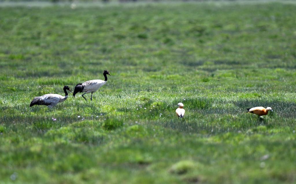 2022年7月2日,兩只黑頸鶴(左一和左二)在青海隆寶國(guó)家級(jí)自然保護(hù)區(qū)內(nèi)活動(dòng)。新華社 韓方方 攝