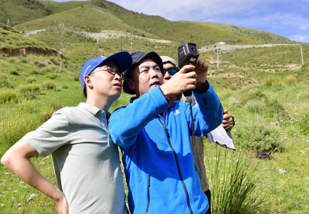 科考隊(duì)員任斐鵬(左二)和隊(duì)友一起用熱紅外儀觀(guān)測(cè)長(zhǎng)江源區(qū)植被熱環(huán)境效應(yīng)。新華社記者 李勁峰 攝
