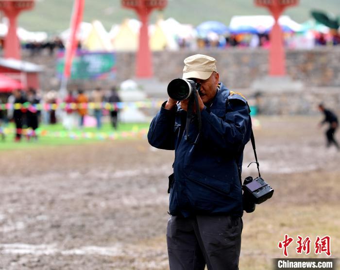 圖為西藏攝影師阿旺洛桑在玉樹傳統(tǒng)賽馬會現(xiàn)場拍攝。薛蒂 攝