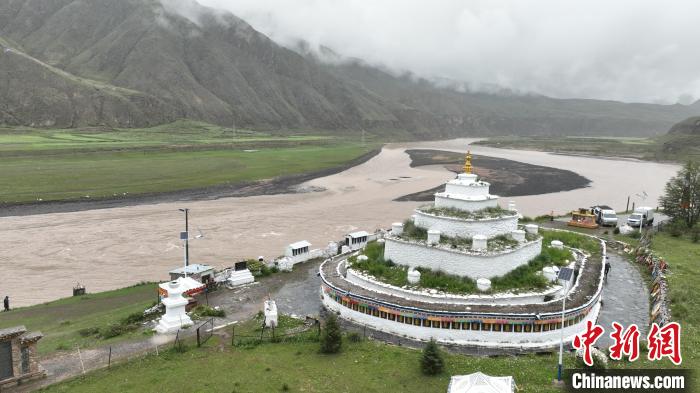 連日來雨水持續(xù),清晨的通天河挾卷泥沙,波濤涌動,河中央的月牙形沙洲被沖刷出柔美的弧線。四周群山青翠、霧靄繚繞,白塔靜靜佇立在古渡口邊,似水墨畫頗具詩意。石階延伸處,牧人緩緩走過轉經筒,遠處村莊籠罩在一片朦朧中。
