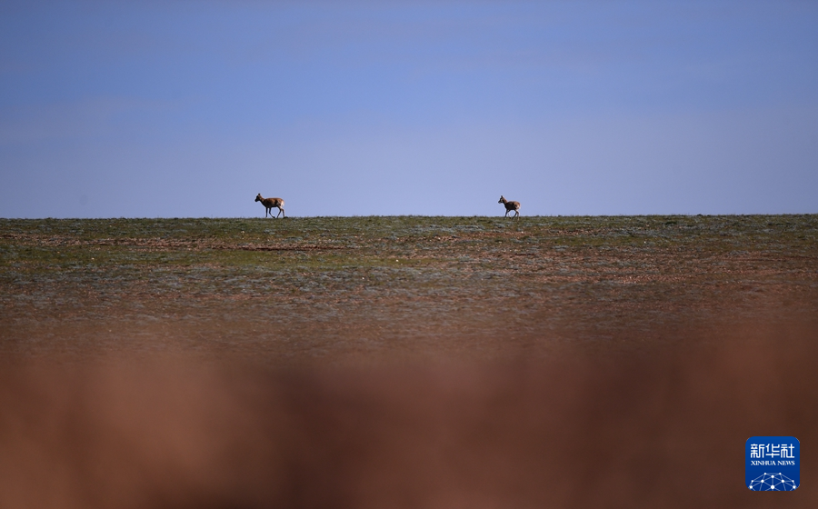 7月27日,兩只藏羚羊在可可西里境內(nèi)活動(dòng)。新華社記者 張宏祥 攝