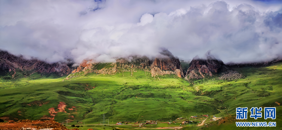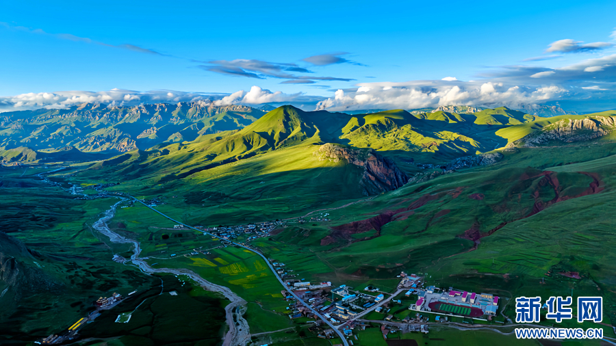 時值盛夏,青海省玉樹藏族自治州景色怡人,群山和草原在藍(lán)天白云的映襯下構(gòu)成壯美的畫卷。