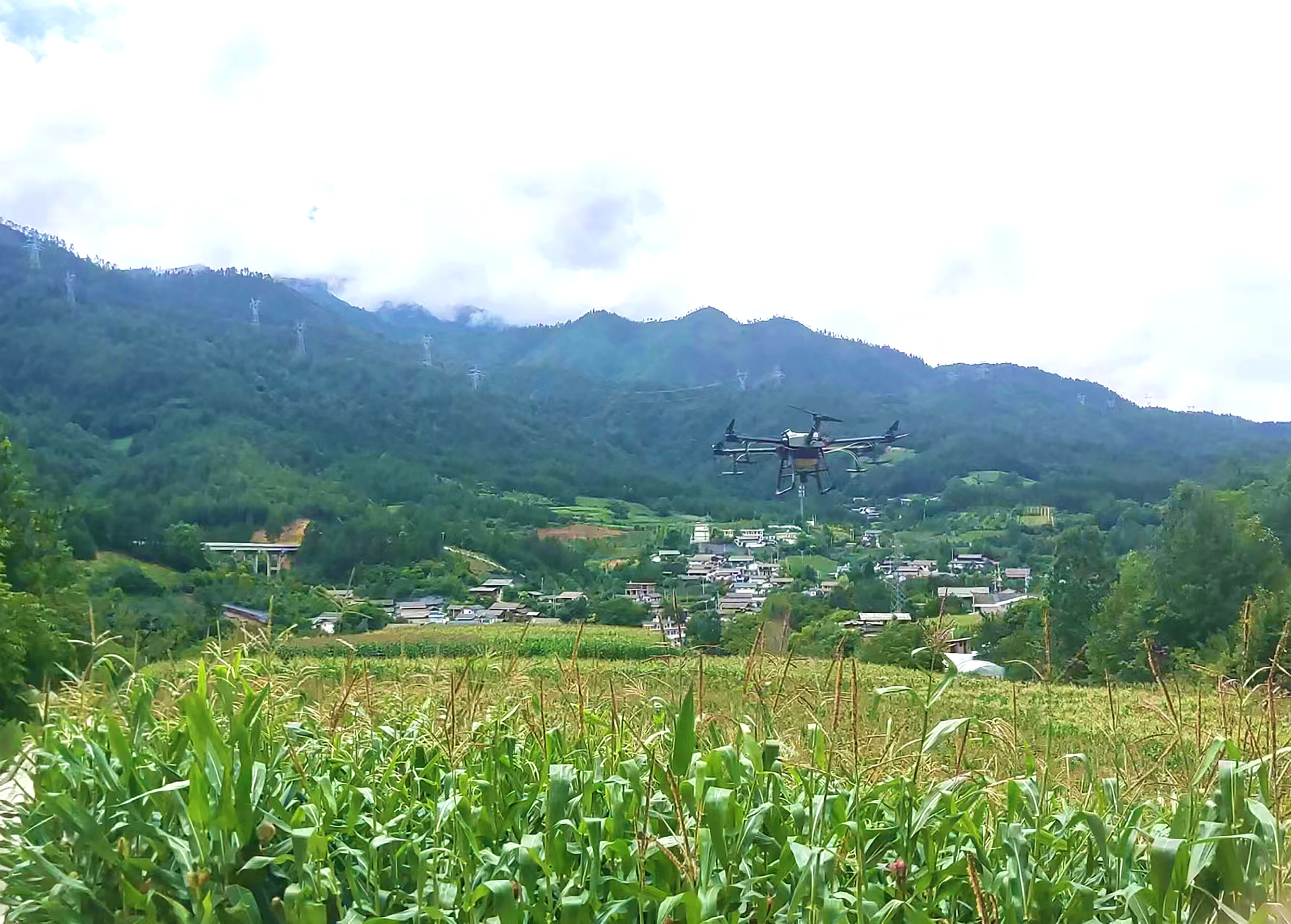 圖為植保無人機正在維西縣永春鄉(xiāng)慶福村進行玉米病蟲害飛防作業(yè)。