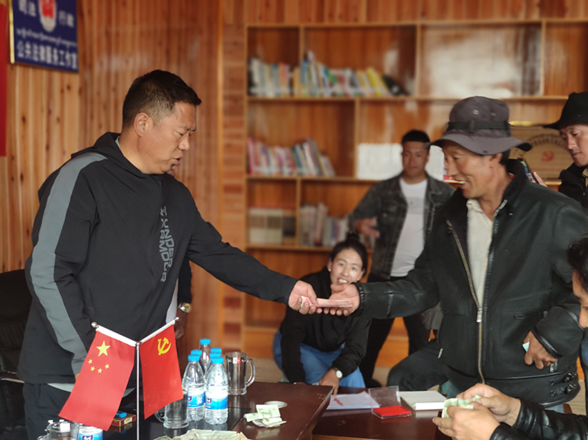 “振業(yè)振興新征程 旺達(dá)村分紅大會(huì)”的橫幅在村活動(dòng)中心會(huì)議室內(nèi)鮮艷顯眼,村民們興高采烈,早早地等候在這里領(lǐng)取分紅金?!敖衲炅鬓D(zhuǎn)費(fèi)總計(jì)130000元,每戶可分紅5200元?!狈旨t儀式上,上木拉黨委書(shū)記格絨次乃向村民們介紹了旺達(dá)村房屋流轉(zhuǎn)、荒地收益情況和民宿產(chǎn)業(yè)下一步規(guī)劃。在場(chǎng)村民臉上無(wú)不洋溢著幸福的笑容,高興地鼓起了掌。