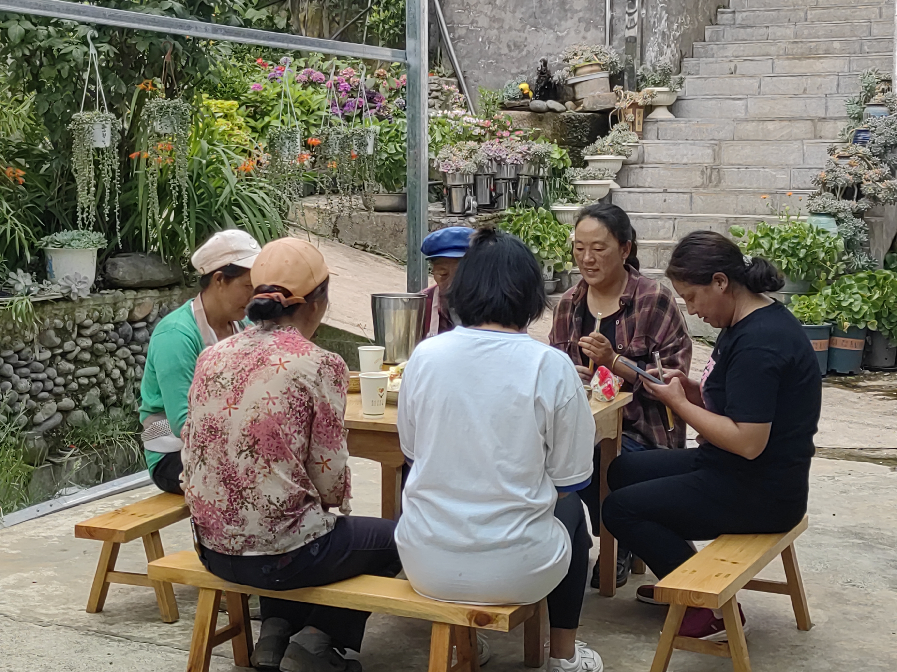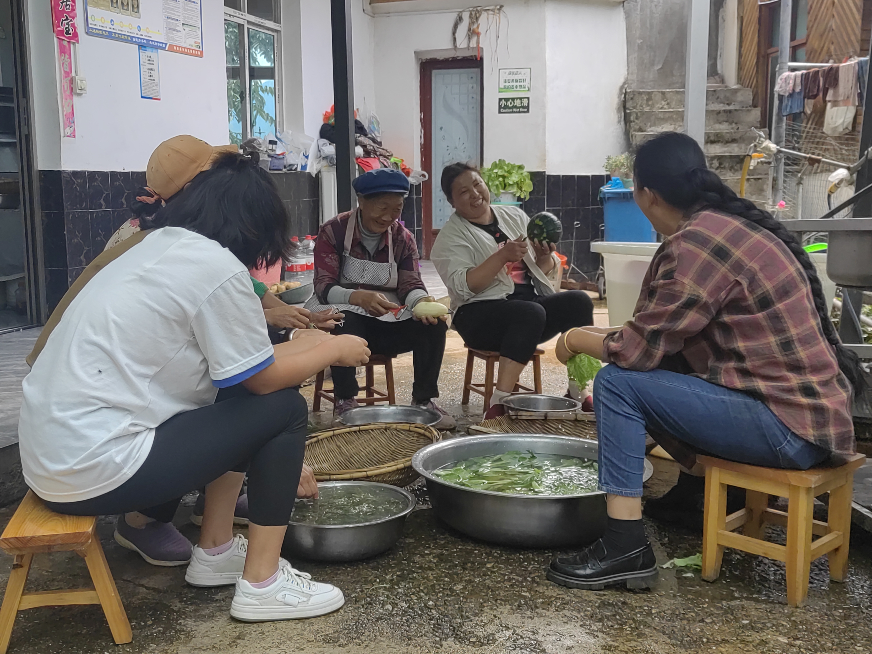 村口,一個(gè)名叫“成姐農(nóng)家樂(lè)”的小院里歡聲笑語(yǔ),熱鬧非凡?!斑@是今天剛挖的洋芋和新鮮采摘的瓜,待會(huì)就給客人做一道當(dāng)?shù)氐奶厣恕瞎涎笥??!薄盁豕瞎涎笥蟮臅r(shí)候,再做個(gè)鍋邊粑粑,這樣的農(nóng)家味道客人肯定喜歡。”在農(nóng)家樂(lè)里忙碌的姐妹們邊洗菜邊討論著當(dāng)天的菜品。