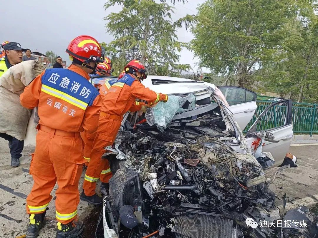 接到調(diào)令后,香格里拉消防救援站立即出動2車13人前往處置,到達(dá)現(xiàn)場后,發(fā)現(xiàn)一輛小轎車與一輛貨車相撞,轎車嚴(yán)重受損變形,車內(nèi)安全氣囊已彈出,副駕駛位被困人員頭部、腿部多處受傷無法動彈,意識模糊,有嚴(yán)重生命危險。