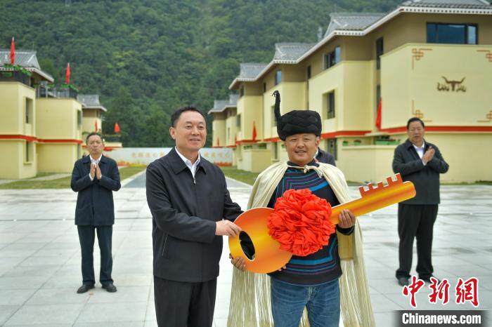 9月5日,在四川甘孜州瀘定縣磨西鎮(zhèn)大杉樹村(幸福新村)集中安置點(diǎn),甘孜州委書記沈陽(yáng)(左)向村民代表發(fā)放新房鑰匙。中新社記者 劉忠俊 攝