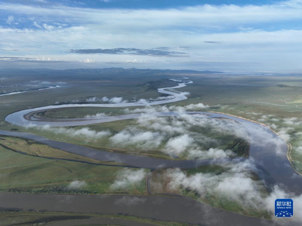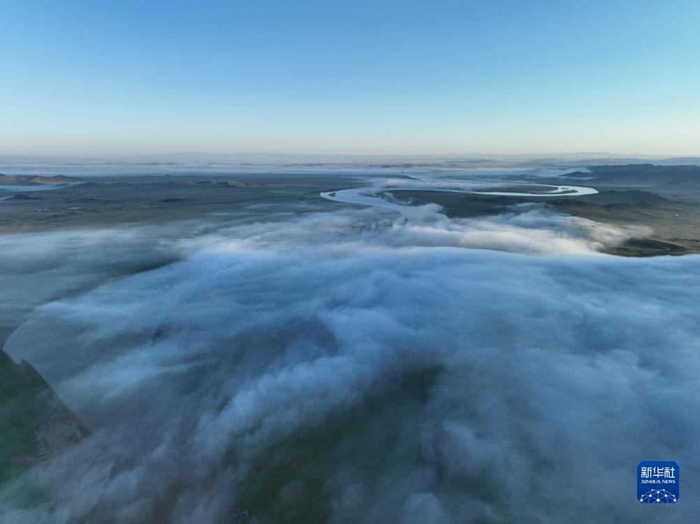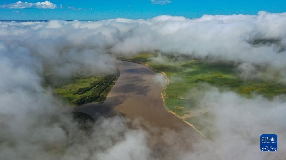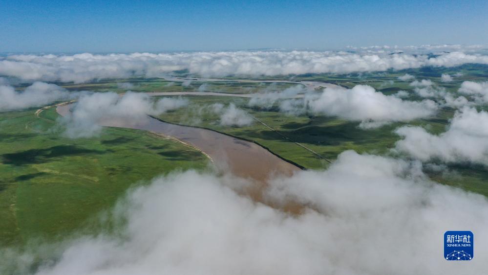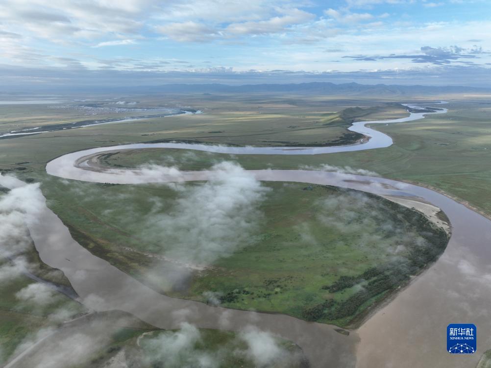 這是8月22日清晨在四川省阿壩藏族羌族自治州若爾蓋縣唐克鎮(zhèn)拍攝的黃河九曲第一灣景色(無人機(jī)照片)。新華社記者 邢廣利 攝