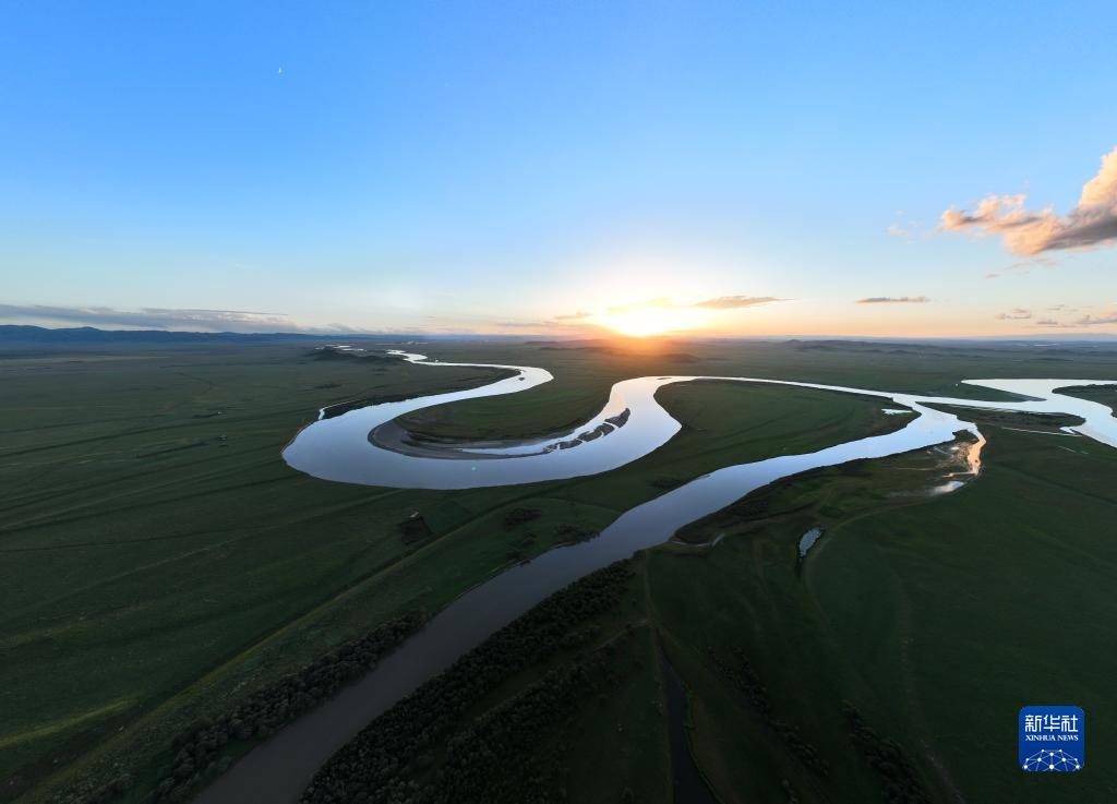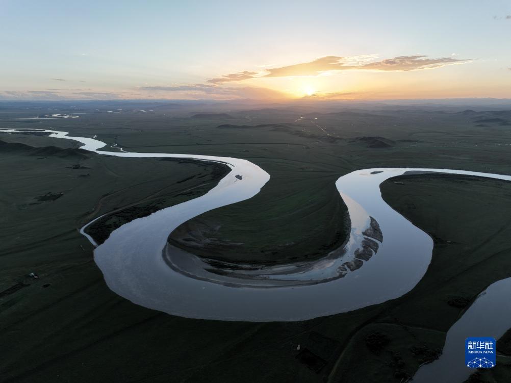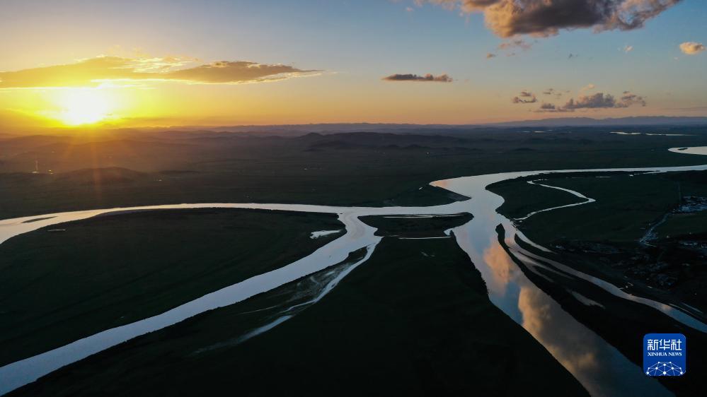 這是8月21日在四川省阿壩藏族羌族自治州若爾蓋縣唐克鎮(zhèn)拍攝的黃河九曲第一灣落日(無人機(jī)照片)。新華社記者 王曦 攝