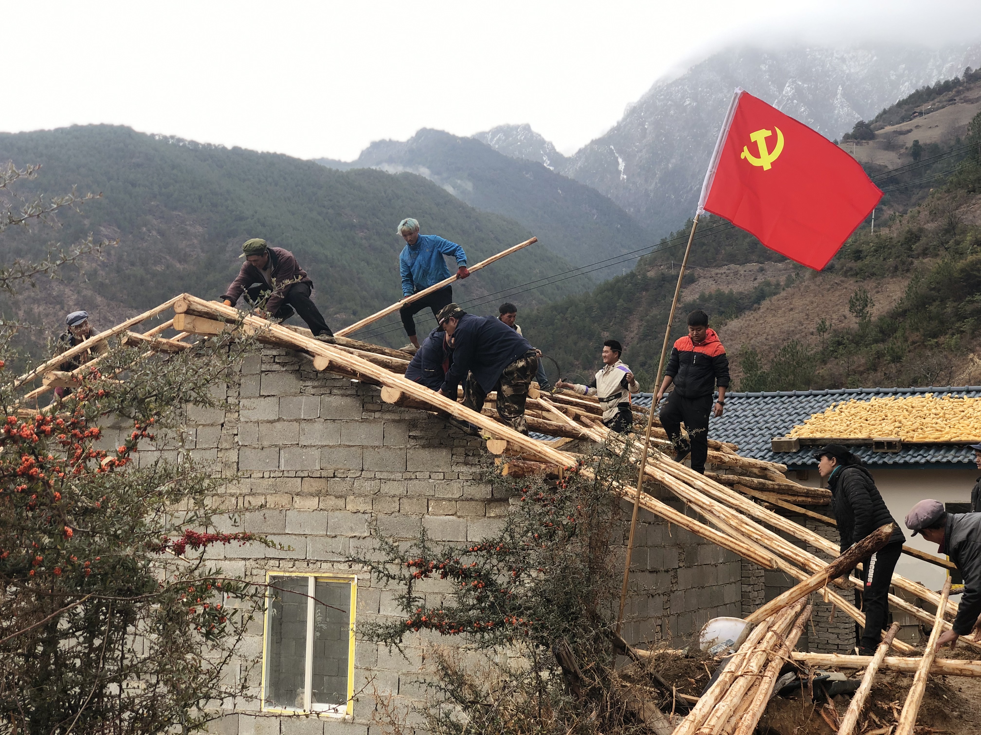 維西縣葉枝鎮(zhèn)同樂村第二黨支部組織黨員幫助群眾修繕房屋。
