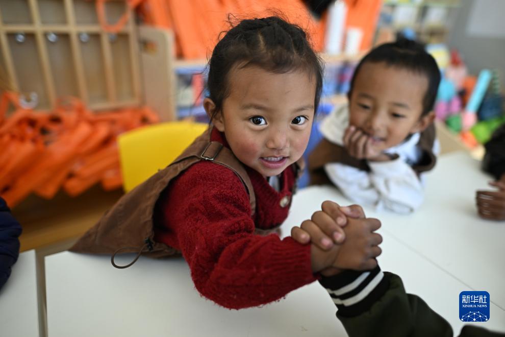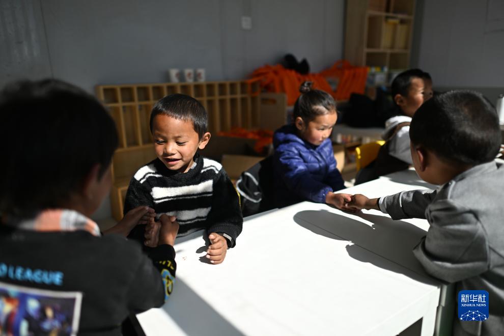 在青海省玉樹藏族自治州曲麻萊縣秋智鄉(xiāng)布甫村陽光幼兒園,丁增巴桑(左)和伙伴們?cè)诮淌覂?nèi)玩耍(9月14日攝)。新華社記者 張宏祥 攝