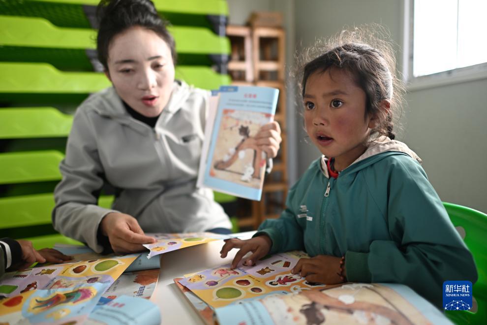 在青海省玉樹藏族自治州曲麻萊縣秋智鄉(xiāng)布甫村陽光幼兒園,秋智鄉(xiāng)幼兒園副園長(zhǎng)才仁戰(zhàn)斗在課堂上(9月14日攝)。新華社記者 韓方方 攝