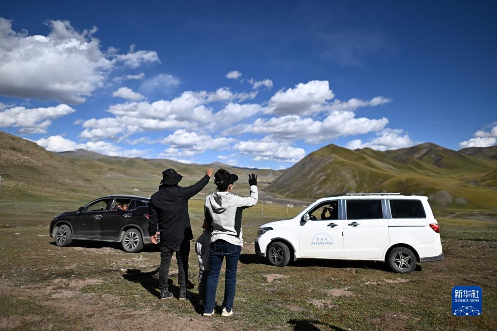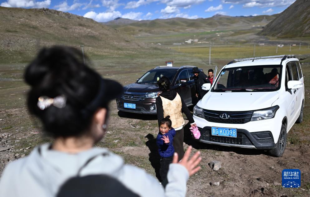 在青海省玉樹藏族自治州曲麻萊縣秋智鄉(xiāng)布甫村陽光幼兒園,老師與學(xué)生家長(zhǎng)告別(9月14日攝)。新華社記者 張宏祥 攝